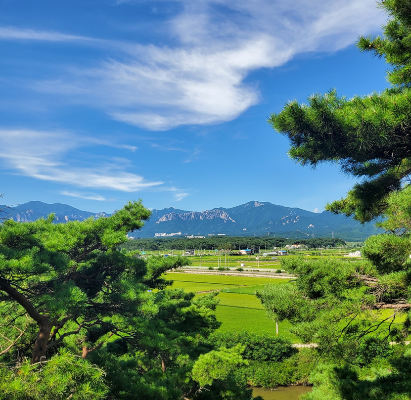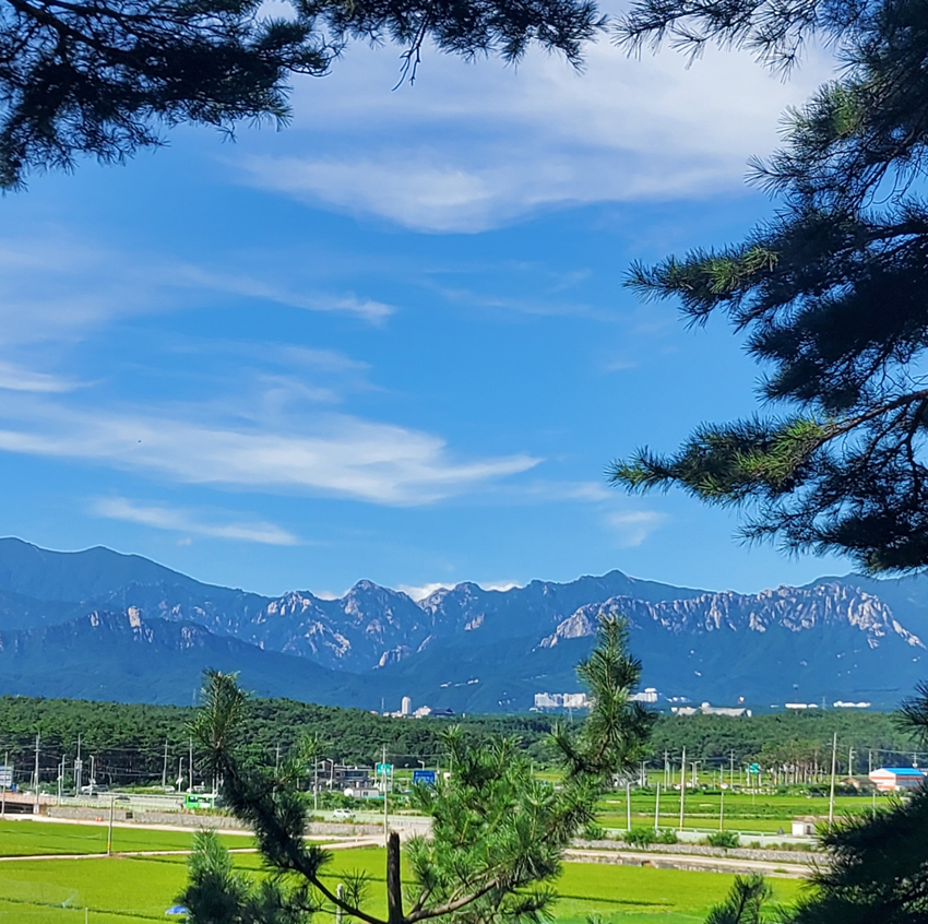 뿐만 아니라 청간정의 뒤로는 설악산도 보입니다. 넓은 논밭을 넘어 설악산도 든든하게 뒤에서 지켜주고 있었어요. 앞은 바다, 뒤는 설악산이 있어 사방에 자연이 감싸고 있는 느낌을 크게 받을 수 있었습니다. 날이 정말 맑은 날엔 설악산도 깨끗하게 보여요.