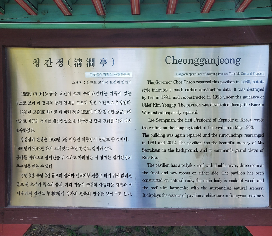 청간정은 1560년 이전에 세워진 것으로 추정되는데 나무로 지어진 목조 건물이라 1881년에 화재로 소실 되었다가 다시 재건했지만 한국 전쟁 당시 또다시 불에 타 다시 보수되었다고 합니다. 옛 문인들이 풍류를 즐기던 장소로 알려져 있는데 앞은 넓은 바다와 뒤로는 설악산의 울산바위들이 지키고 있어 자연을 즐기고 풍류를 즐기기에 더없이 좋은 장소였던 것 같습니다.