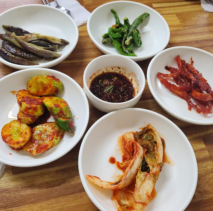 공깃밥과 기본 반찬으로 나온 가지, 오이, 꽈리고추, 황태무침, 김치 그리고 순두부에 빠질 수 없는 간장! 반찬은 늘 동일한 것 같더라고요!ㅎㅎ
