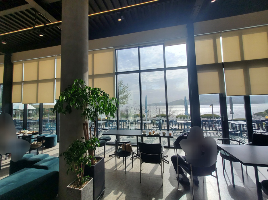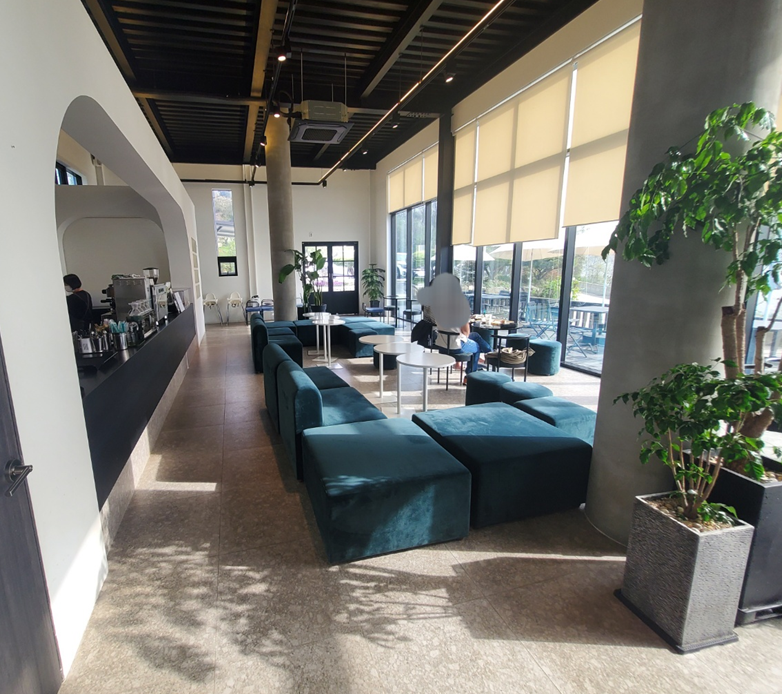 넓은 소파들이 바다를 향해 볼 수 있도록 위치해 있어서 어딜 앉아도 바다를 즐길 수 있겠더라고요!  입구 쪽 공간에도 자리가 있어 모임을 하거나, 중요한 이야기 할 때 자리 잡기 딱 좋을 거 같았어요.ㅎㅎ 넓은 테이블들이 있어서 단체로 오게 될 경우 좋겠다는 생각도 들었습니다. ㅎㅎ