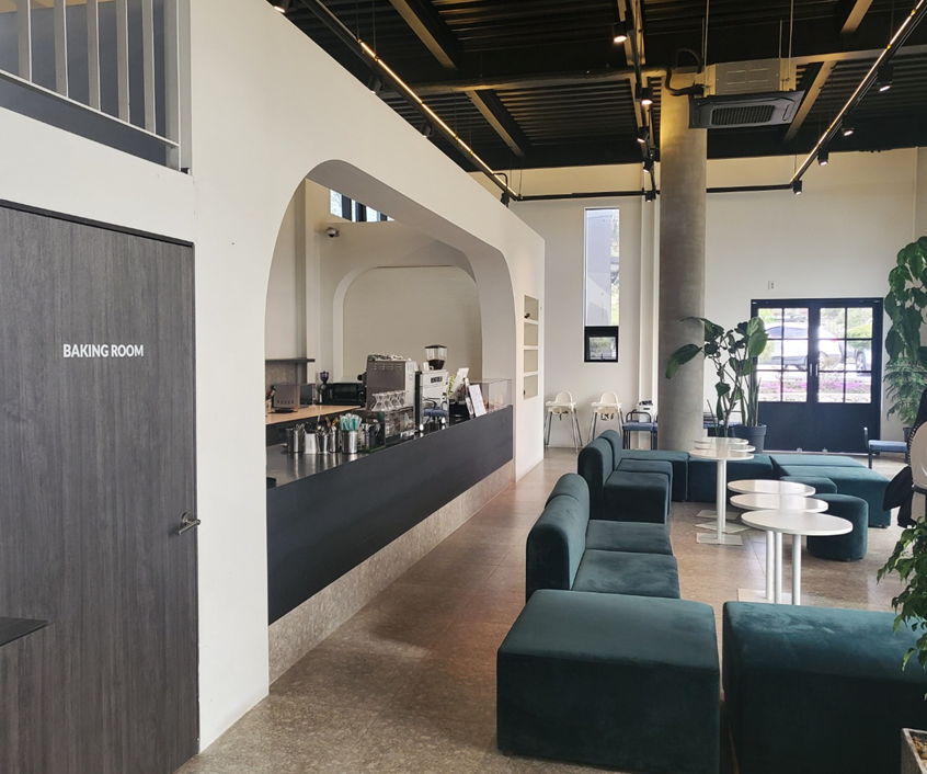 건물 앞에는 테라스 석이 많이 있습니다! 날씨가 조금 추워서 실내로 들어갔는데, 덜 추웠다면 저는 테라스 석에 앉아 바다 전경을 보며 시간을 누렸을 거예요..ㅎㅎ 건물 뒤로 가면 야외 공간도 있어요! 날씨가 선선해지면 이 공간도 좋을 거 같더라고요! 바다 쪽과 반대로 논, 밭, 산이 있어서 평온 그 자체였습니다. ㅎㅎ