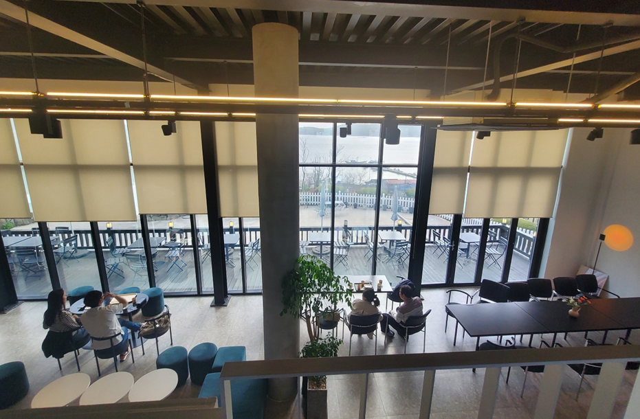 음료를 주문하고 좀 더 둘러봤는데 통유리 창에 가슴이 다 시원하더라고요..! 여기서 일하시면 힐링도 하고 너무 좋으실 거 같다는 생각이 많이 들었습니다..ㅎㅎ 너무 부러운 직장.. 물론 해가 질 즈음이라 뜨거워서 버티칼을 내려놓으셨더라고요! 아쉽지만 이 정도도 만족할 정도로 시원한 뷰였습니다 ㅎㅎ