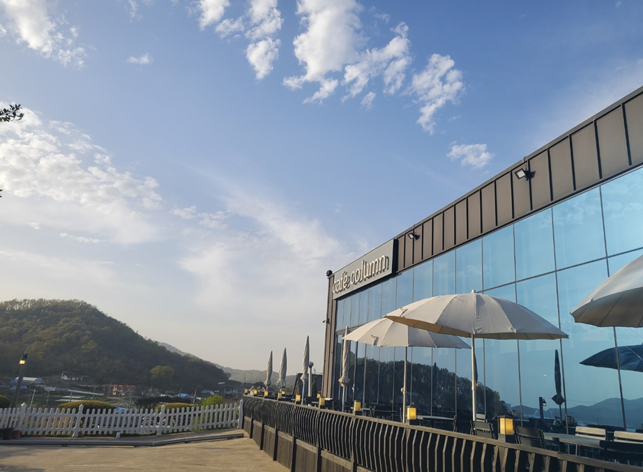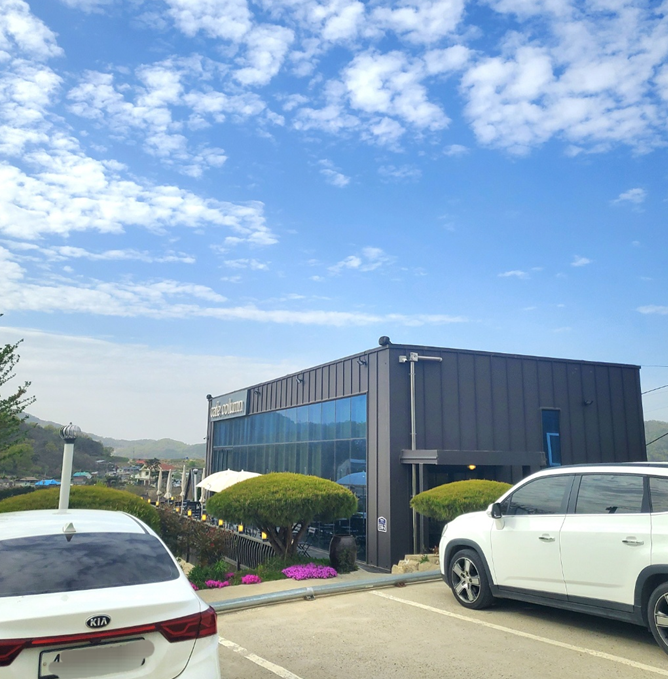 <카페 칼럼>은 석모도 가기 전, 양도면에 있어요.! 가는 길에 자주 듣던 낚시 포인트도 구경하고 신나게 드라이브하다 보니 목적지에 도착했습니다! 처음엔 조금 많이 당황했어요! 도착한 줄 알았는데 차를 타고 언덕을 올라야 했거든요! 초보 딱지 붙이고 다니는 저는 세상 최고 겁쟁이었지만, 프로 베스트 드라이버인 디저트 짝꿍은 거침없이 휠을 돌리며 올라갔답니다.ㅎㅎ 그리고 열심히 올라가 보면..!!
