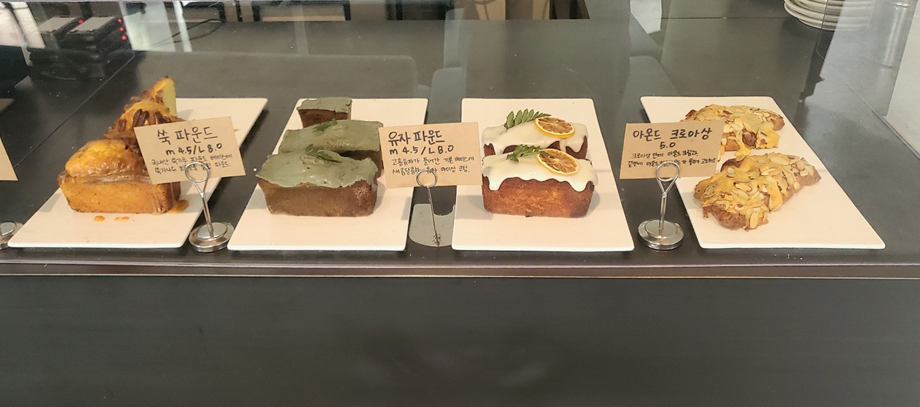 카페에 들어가자마자 본 것은 사실 디스플레이 되어있는 디저트였어요.ㅎㅎ 사진에는 짤렸지만, 저희는 피칸 캐러멜 파운드(L)를 주문했어요! (M 4,500 / L 8,000) 기본 파운드 빵 위에 수제 캐러멜과 피칸이 올라가 있습니당ㅎㅎ 그리고 저는 카페인 바보이기에.. 쑥크림라테와 디저트 짝꿍은 라테를 주문했어요.ㅎㅎ