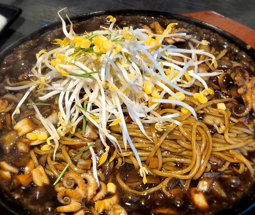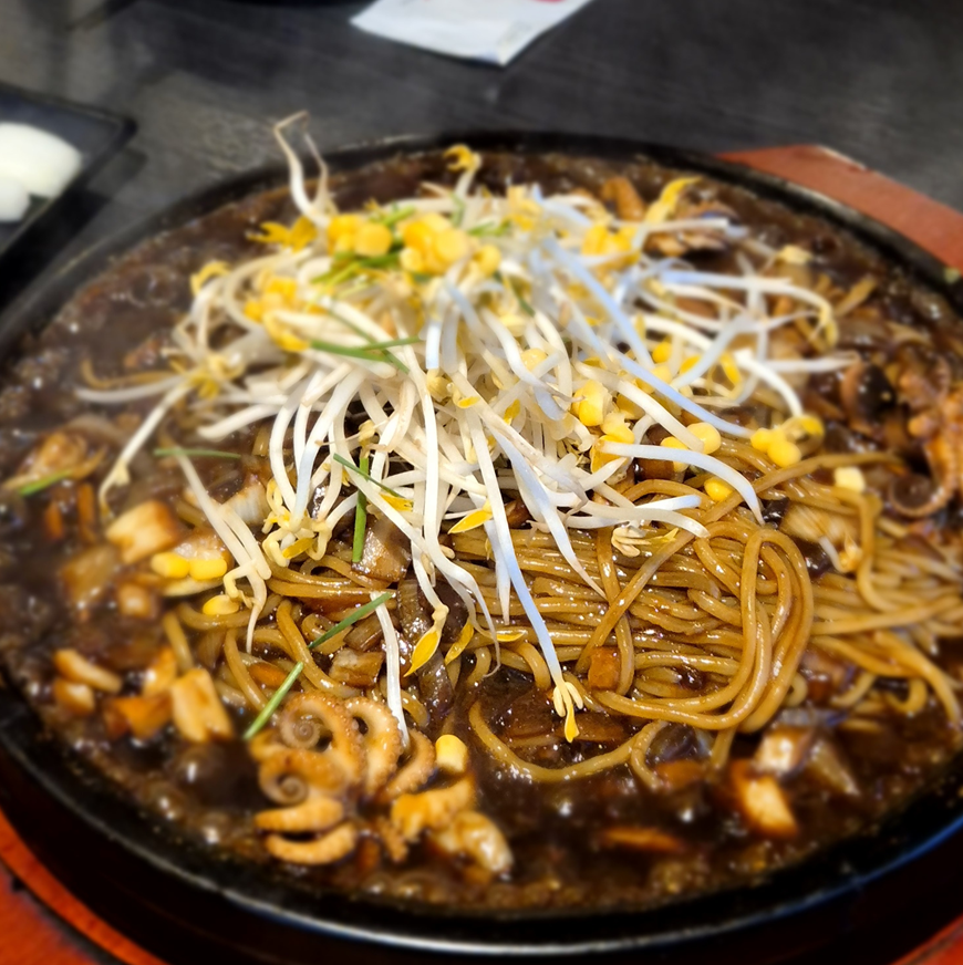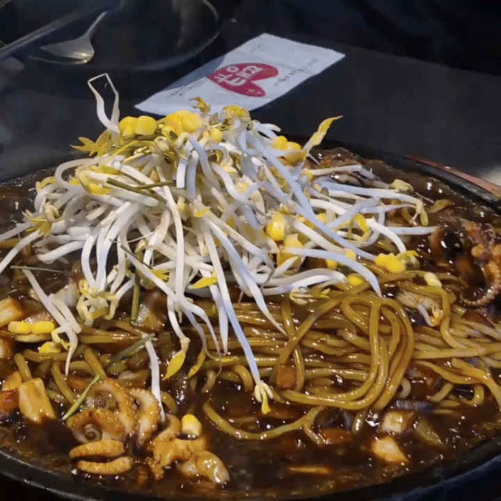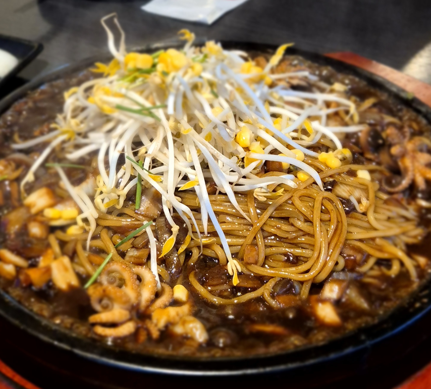 처음 나오면 넓은 돌판 위에 숙주를 올린 해물짜장이 지글지글 끓는 채로 나옵니다. 상당히 뜨거우니 조심해야 합니다.