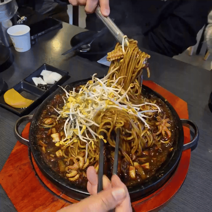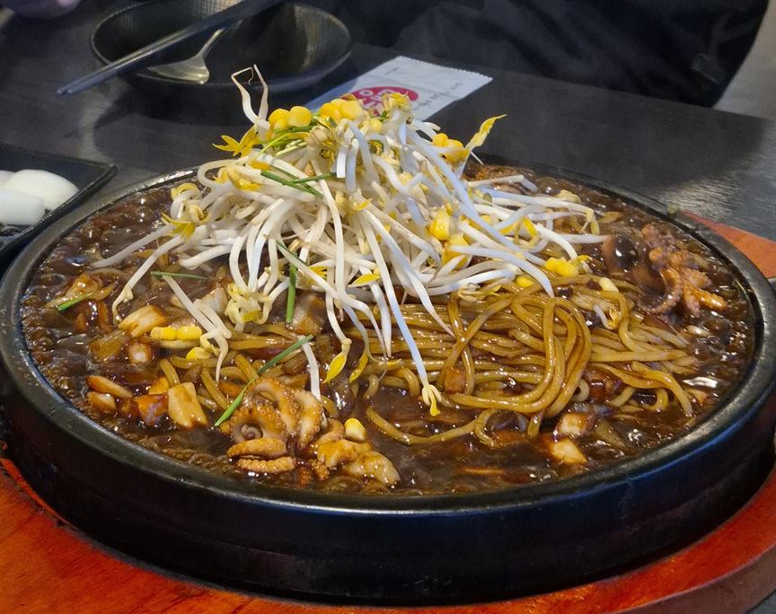 처음 나오면 넓은 돌판 위에 숙주를 올린 해물짜장이 지글지글 끓는 채로 나옵니다. 상당히 뜨거우니 조심해야 합니다.