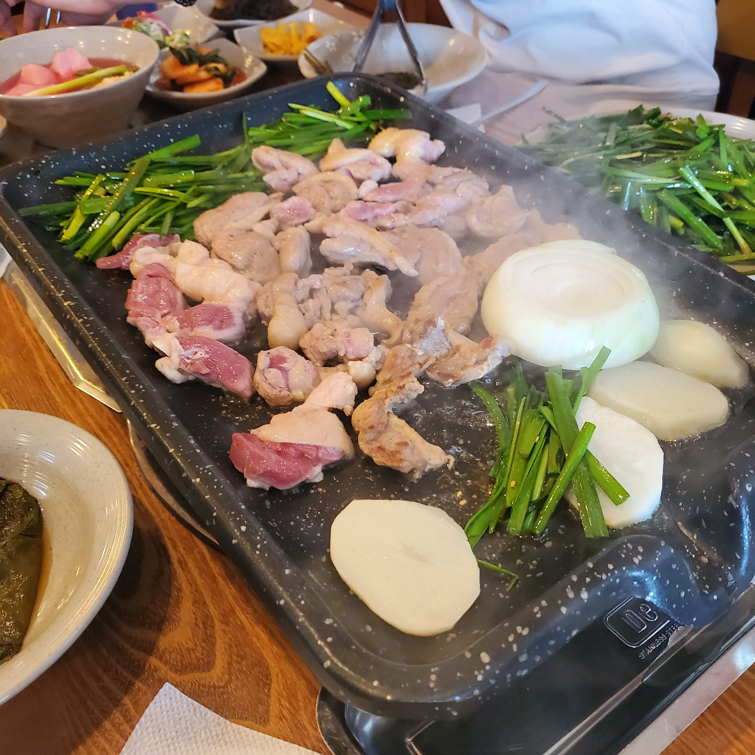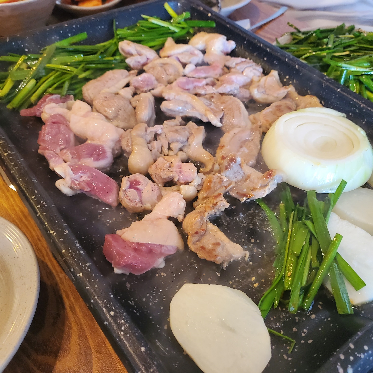 부추도 한가득 있어서 마음이 푸짐해졌습니다. ㅎㅎ 고기를 구울 때 부추도 같이 구워 먹으면 맛있는 거 다들 아시죠?ㅎㅎ 오리 기름에 구워진 양파도 정말 맛있었어요.ㅎㅎ
