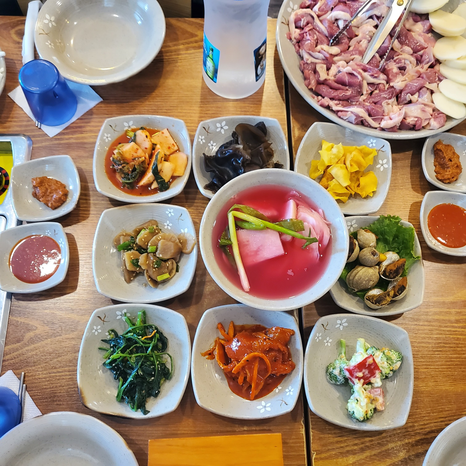 상차림은 두 테이블에 세 세트를 놔주셨어요! 양쪽 끝에 앉은 사람도 모두 넉넉하고 편하게 먹을 수 있어서 좋더라고요! 게다가 반찬도 하나같이 정말 맛이 있었습니다! 가자미 무침도 맛있어서 한 접시 추가 했고요, 특히 비트를 넣어 분홍분홍한 동치미가 정말 일품이었어요! 뒤에 앉은 다른 테이블 손님들도 동치미 따로 구매하시려고 사장님께 여쭤보고 계시더라고요!ㅎㅎㅎ