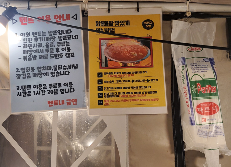 텐트 내부에도 안내와 메뉴가 있어요.ㅎㅎ 야외 텐트 이용 시 셀프이기 때문에 추가 반찬도 셀프로 챙겨야 합니다! 앞치마, 물티슈, 비닐장갑은 식당 내부에 구비되어 있고, 1시간 20분 동안 식사를 하시면 돼요! 그리고 금연 구역이라는 것!