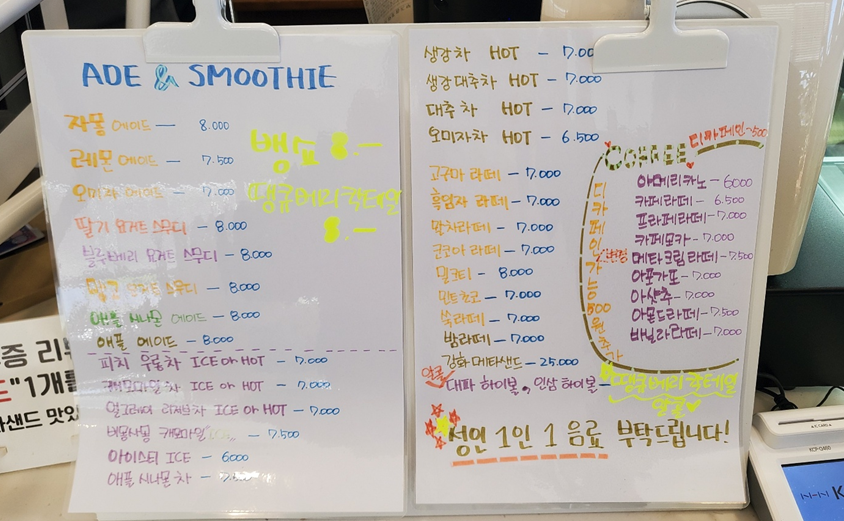 주문을 하기 위해 카운터로 갑니다.ㅎㅎㅎ 메뉴판이 너무 귀엽죠.ㅎㅎㅎ 저는 오미자 에이드를 주문했어요.ㅎㅎ 그리고 강화 메타샌드를 판매하는데 영수증 후기를 작성하면 하나 서비스로 받을 수 있습니다. ㅎㅎ 저도 하나 받았어요.ㅎㅎ 시그니쳐 하이볼을 판매하는데 대파 하이볼, 인삼 하이볼이더라고요!ㅎㅎ 특이했으나 술을 못 마시는 저는 오미자 에이드로 만족합니다. ㅎㅎ