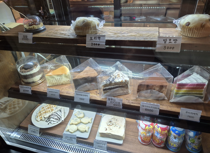 쇼케이스엔 케이크들과 간식이 있어요. 저희는 깔루아 마키아토를 주문했어요.