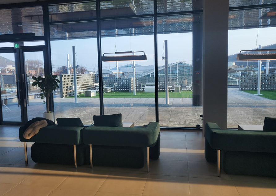 그리고 제가 앉았던 소파 맞은편으로는 테라스가 있어서 날이 풀려 봄, 가을에 머물기 아주 좋을 것 같았습니다. ㅎㅎ 이케아 같은 포토존 앞에 나가는 문이 있어요. ㅎㅎ 그리고 바로 보이는 세모 지붕이 온실입니다. ㅎㅎ 마치 유럽의 한적한 교회 같아 보이네요.ㅎㅎ 먹을 것 채웠으니 온실을 즐기러 갔습니다. ㅎㅎ