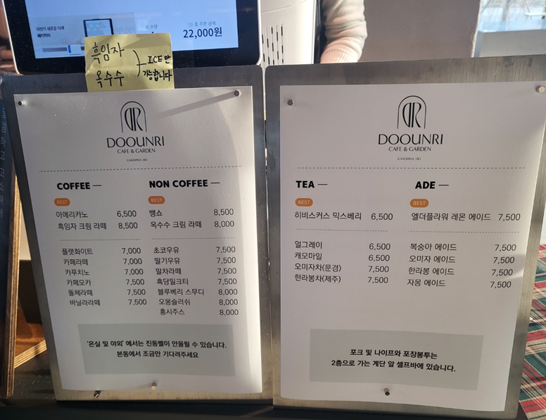 같은 메뉴판이지만 왼쪽 메뉴판에는 시그니처 메뉴로 소개된 음료가 있어서 두 개 다 찍었는데 편한 것으로 참고하시면 될 것 같아요.ㅎㅎ 저와 지인은 시그니처 메뉴로 골라 시그니처 흑임자 크림라떼, 시그니처 옥수수 크림라떼를 주문했습니다. ㅎㅎ 참! 온실 및 야외에서는 진동벨이 울리지 않으니 꼭 기다렸다가 가세요!