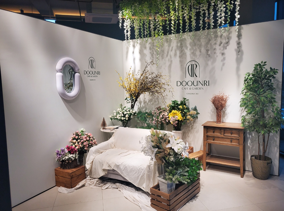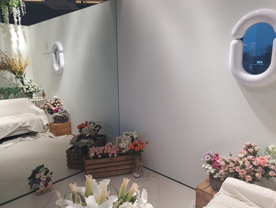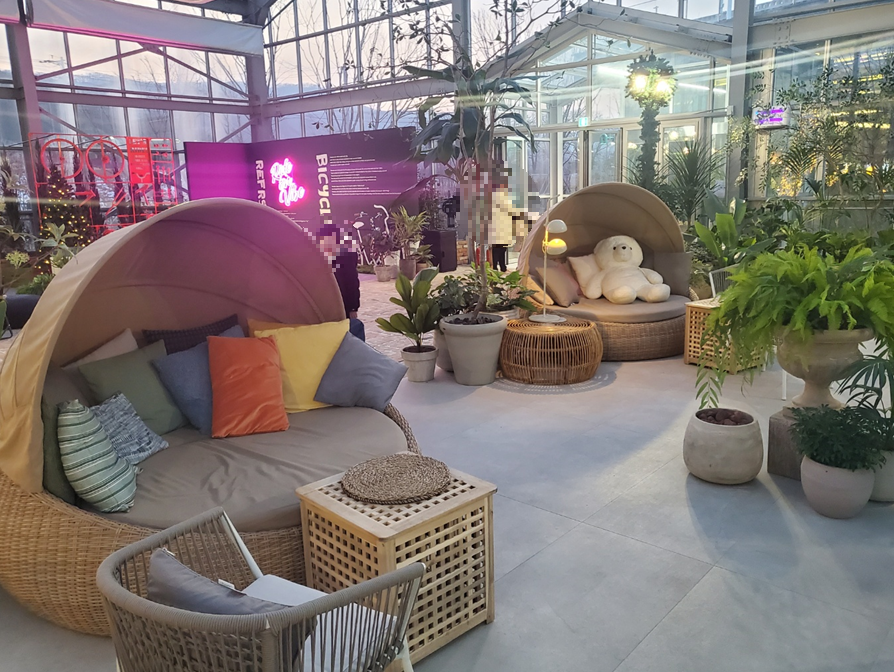 저희는 온실이 보이는 소파에 앉았는데 사진 찍는 스팟이 또 있어서 사람들이 많이 왔다 갔다 하시더라고요.ㅎㅎ 바로 2층 트리와 거울 뒤에 이런 사진 찍은 포토존이 있어요.ㅎㅎ 마치 이케아에 있는 것 갖죠.ㅎㅎ 온실 콘셉트와 어울리는 꽃들로 꾸몄고, 소파 앞에는 마찬가지로 거울이 있어서 많은 분들이 사진 찍기 위해 기다리셨습니다. ㅎㅎ