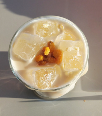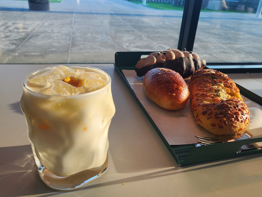 저는 음료와 빵을 먹기 위해 포토존은 기다리지 않았습니다. ㅎㅎ 제가 주문한 시그니처 옥수수 크림라테입니다. ㅎㅎ 초당 옥수수 우유 맛 같이 느껴졌고, 잘 저어서 먹지 않으면 내용물이 갈아 앉아서 먹기 조금 불편하더라고요! 잘 저어 드시며 문제없답니다. ㅎㅎ 그리고 토핑으로 올라간 밭두렁 같은 옥수수 알갱이들이 저는 더 맛있었는데 빨대로 먹으면 구멍에 막히기 때문에 저는 빨대 없이 그냥 마셨어요.ㅎㅎㅎ