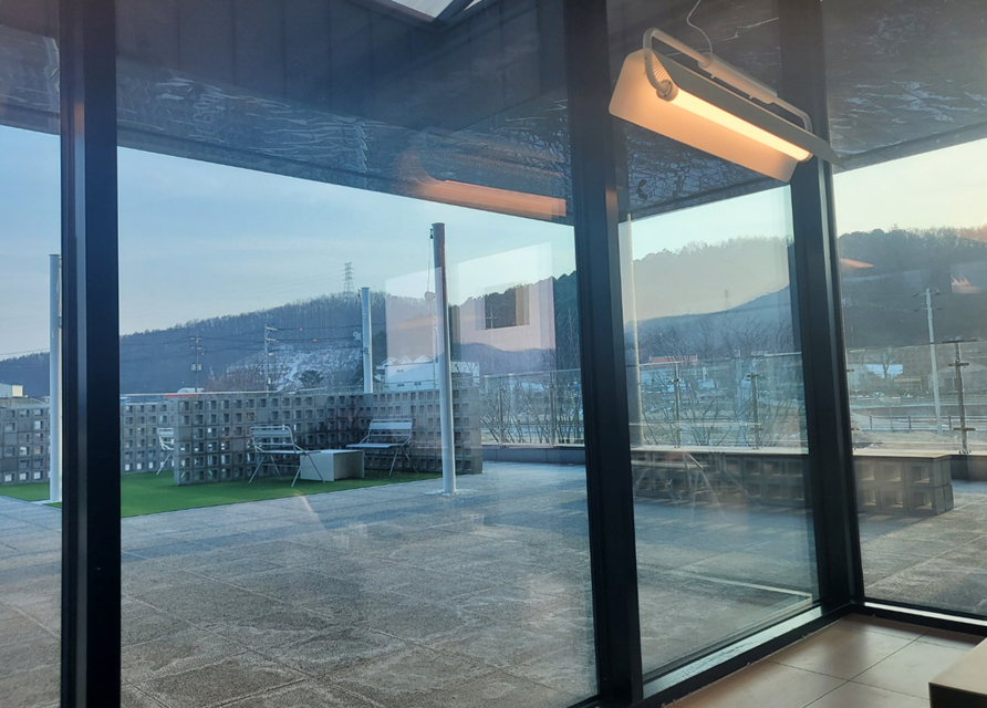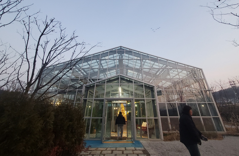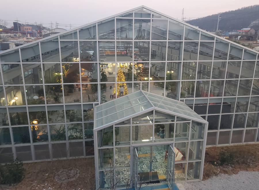 그리고 제가 앉았던 소파 맞은편으로는 테라스가 있어서 날이 풀려 봄, 가을에 머물기 아주 좋을 것 같았습니다. ㅎㅎ 이케아 같은 포토존 앞에 나가는 문이 있어요. ㅎㅎ 그리고 바로 보이는 세모 지붕이 온실입니다. ㅎㅎ 마치 유럽의 한적한 교회 같아 보이네요.ㅎㅎ 먹을 것 채웠으니 온실을 즐기러 갔습니다. ㅎㅎ