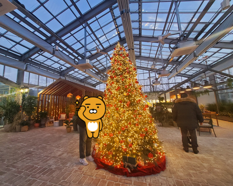 온실로 들어가면 바로 예쁜 트리를 볼 수 있어요.ㅎㅎ 다들 트리맛집이라고 하는 이유가 있었네요.ㅎㅎ 날도 차츰 어두워져 트리 빛이 더욱 아름다웠습니다. ㅎㅎ