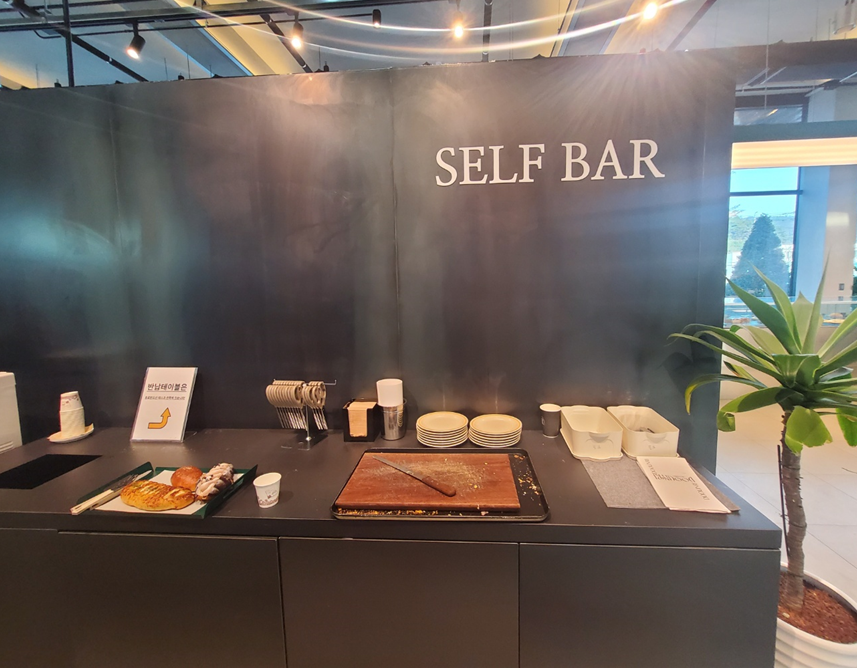 2층으로 가는 계단 맞은편에는 셀프바가 있어서 남은 빵을 포장하거나 필요한 식기들을 준비해서 가져가면 됩니다.ㅎㅎ 그리고 오븐이랑 전자레인지도 있어서 빵을 따뜻하게 데워 먹을 수 있습니다. ㅎㅎ 저희도 바질 토마토 빵과 소금빵을 살짝 데웠습니다. ㅎㅎ