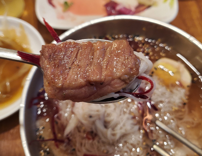 그리고 국룰이죠! 냉면과 함께 먹으려고 고기를 아껴두었습니다.ㅎㅎㅎ 냉면도 일반 공장에서 나오는 면과 달리 가늘고 부드러워 고기와 같이 씹는데 질긴 것이 없었고, 비트가 들어가 아삭함을 더해 식감과 풍미를 더해줬습니다. ㅎㅎ