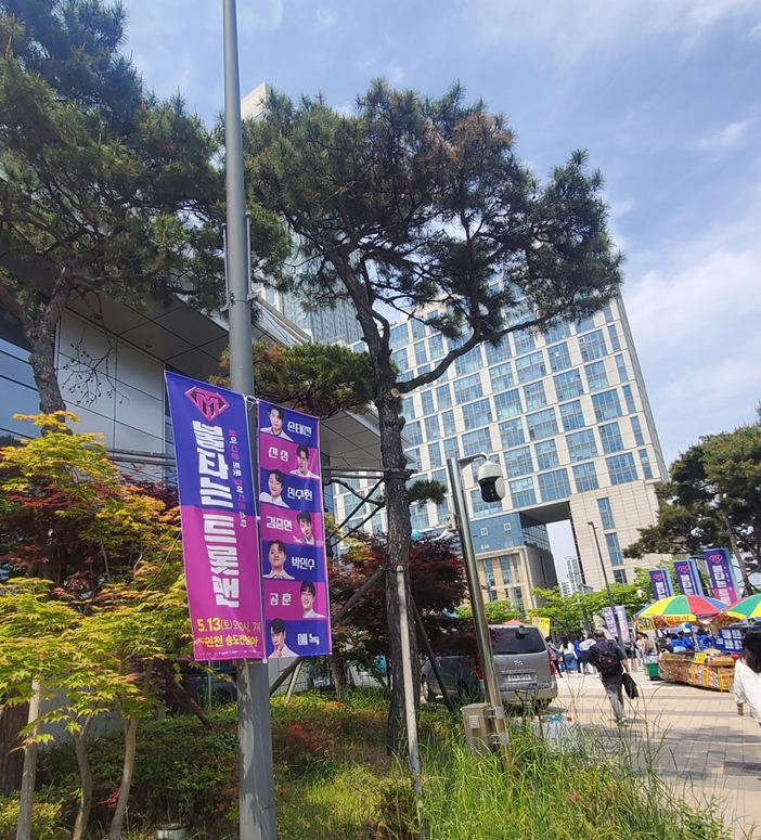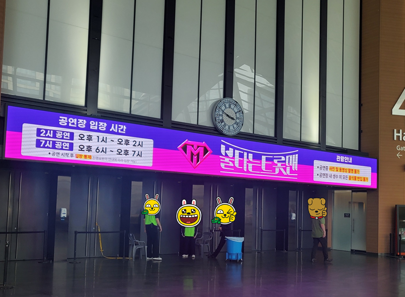 건물 입구 근처로 갈 수 록 많은 저희 엄마 나이 또래로 보이시는 분들이 손수건, 응원봉, 머리띠 여러가지 장식을 하시고 이동을 하시더라고요! ㅎㅎ 아이돌 팬들을 방불케 하는 광경이었습니다!ㅎㅎ 입구에는 간이 포장마차들도 많고, 특히 가수들을 응원할 수 있는 응원도구 판매 장사가 줄을 이었어요!ㅎㅎ 구경하는 것만으로도 재밌었습니다. ㅎㅎ 간혹 음료를 사서 들고 들어가실까 하는 분들이 계셨는데, 공연장에는 물을 제외한 모든 음료는 반입이 금지였습니다! 그리고 머리띠나 시야를 방해하는 응원도구는 못 하게 하니 괜히 앞에서 사면 안 되겠더라고요!