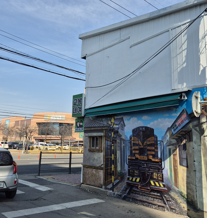 곳곳에 이런 벽화도 볼 수 있어서 벽화를 찾는 재미도 있습니다. ㅎㅎ 보통 주차는 위의 왼쪽 사진에 보이는 이마트에 많이 하신다 하더라고요.ㅎㅎ