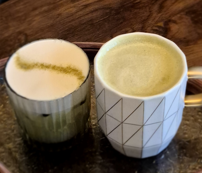 주문 후 예쁜 트레이 위에 말차 슈페너와 말차 라떼가 나왔습니다.