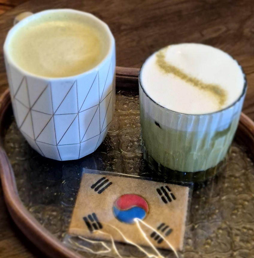 주문 후 예쁜 트레이 위에 말차 슈페너와 말차 라떼가 나왔습니다.