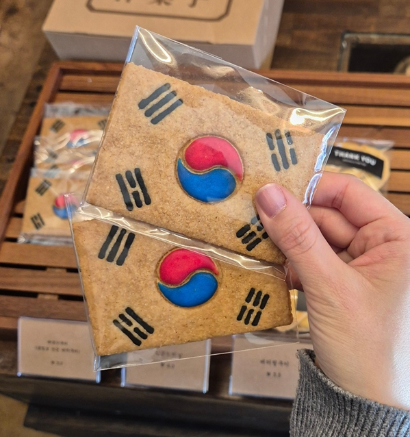 쿠키들도 있고, 이 곳의 시그니처인 태극기 쿠키도 있습니다. 통밀로 만든 버터쿠키예요.