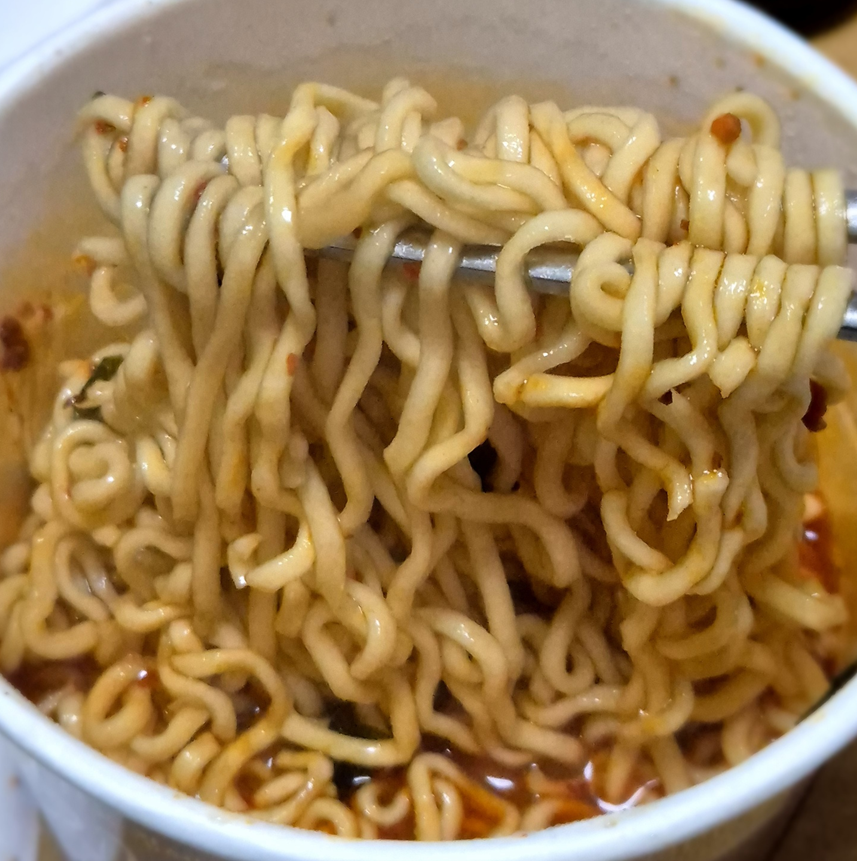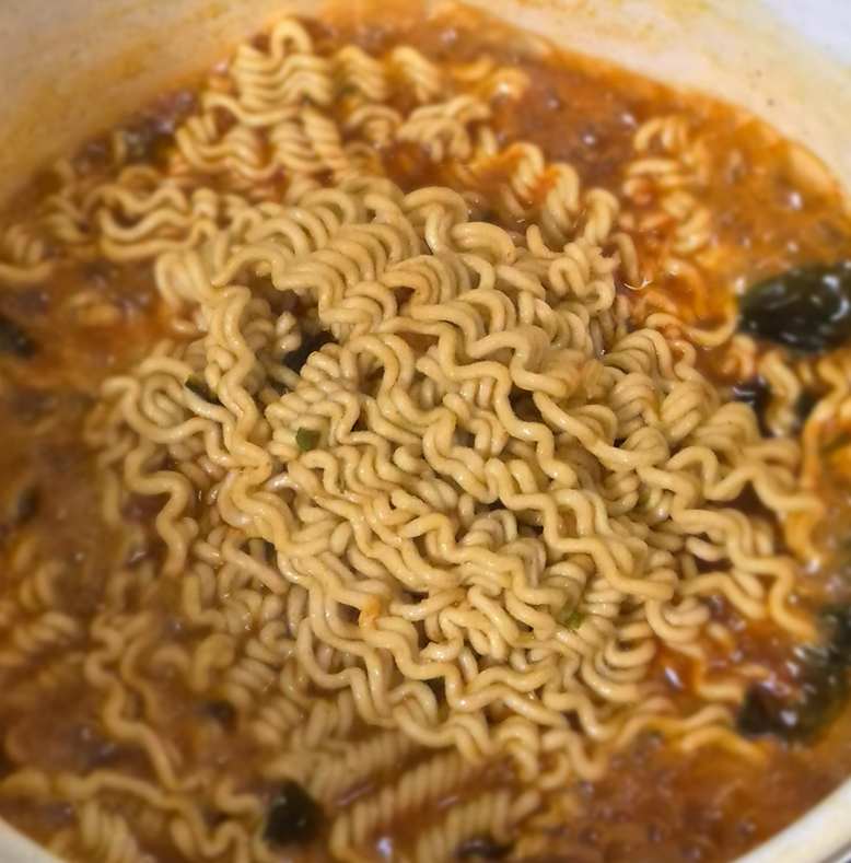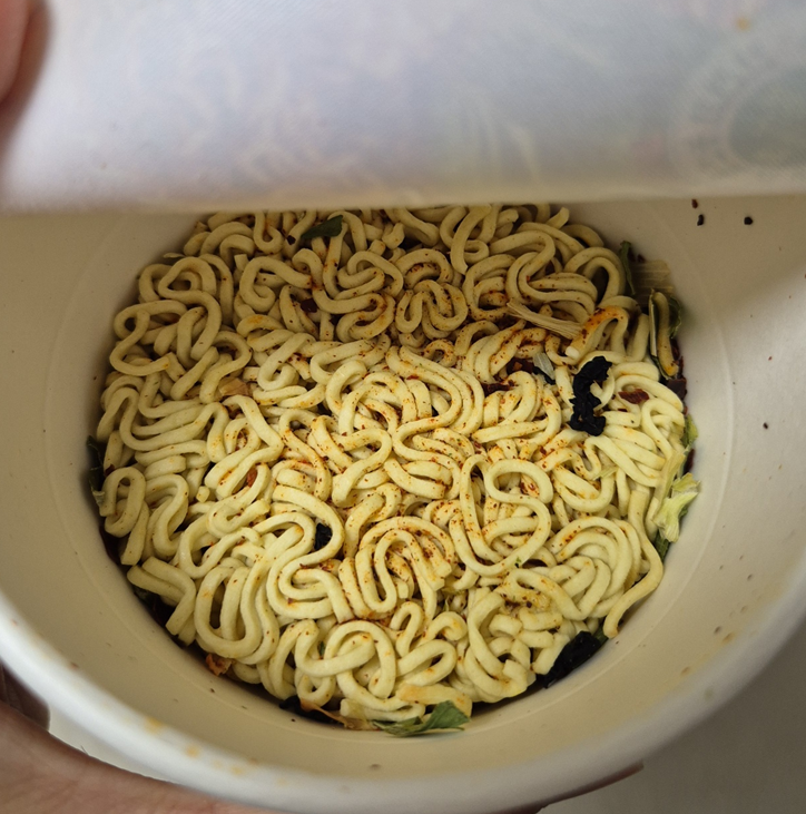 뚜껑을 열면 봉지 라면과 다르게 건더기와 함께 고춧가루가 뿌려져 있는 면이 나옵니다.ㅎ