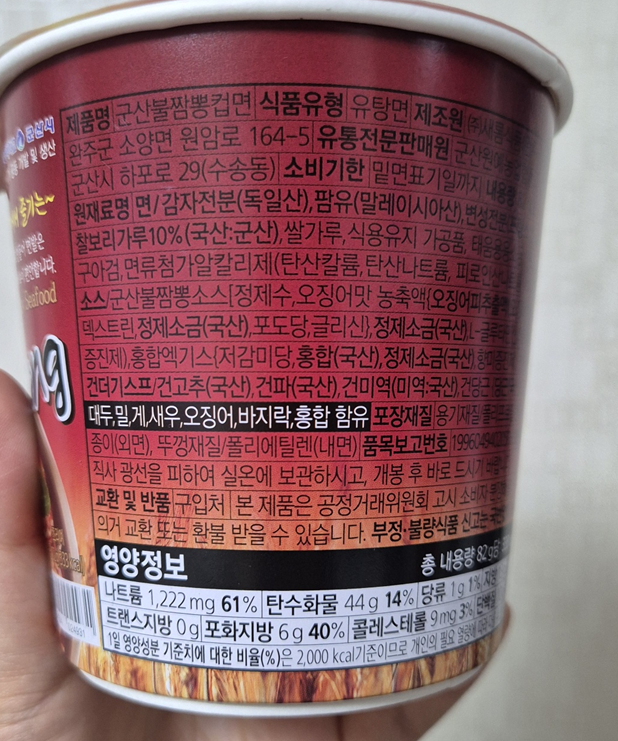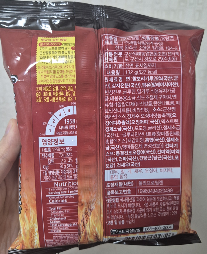 먼저 봉지로 된 군산짬뽕라면입니다. 역시 짬뽕이라 그런지 나트륨 함량이 꽤 높아요.