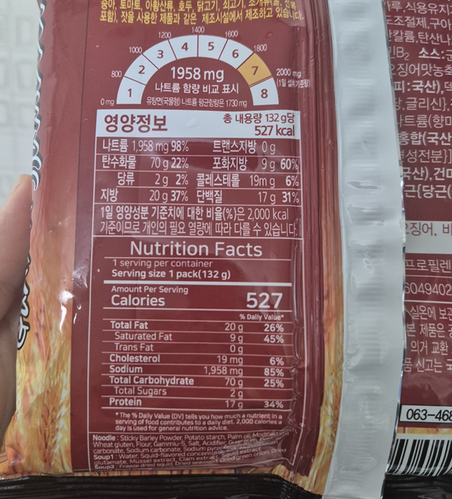 먼저 봉지로 된 군산짬뽕라면입니다. 역시 짬뽕이라 그런지 나트륨 함량이 꽤 높아요.