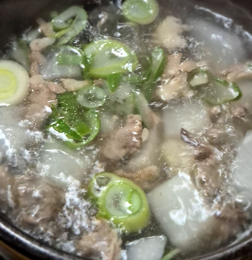 사진을 선명하게 찍고 싶었는데 끓고 있는 순간을 찍어서 그런지 선명하게 찍히지 않았네요.ㅠㅠ 파와 함께 소고기, 무가 한가득 들어 있습니다. ㅎㅎㅎㅎ
