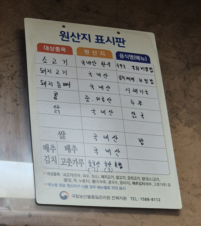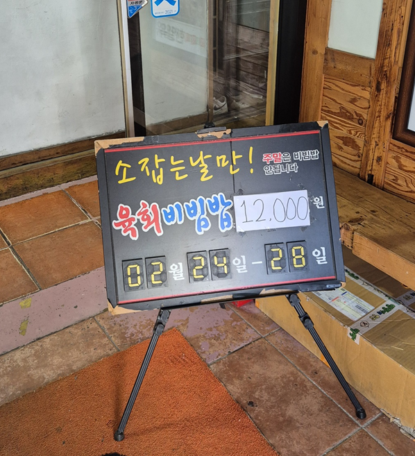 입구에 들어서자마자 사인이 한가득 붙어 있고, 육회비빔밥이 가능한 시간도 안내되어 있어요. 육회비빔밥은 낮 12시부터 가능하고 공휴일과 주말은 불가하니 참고하세요!