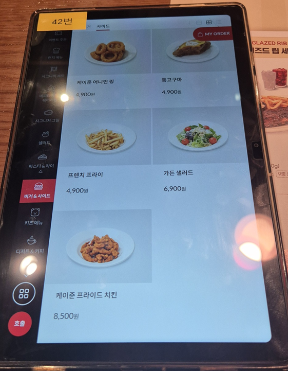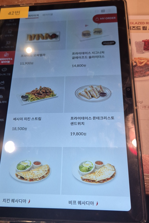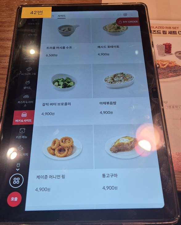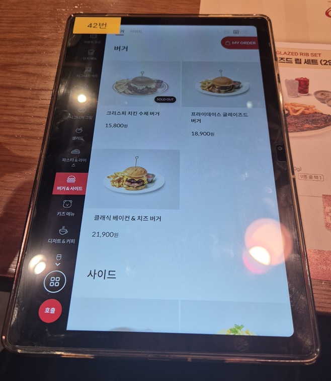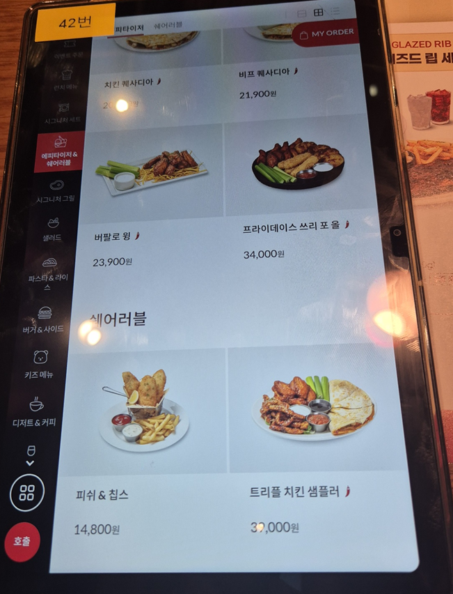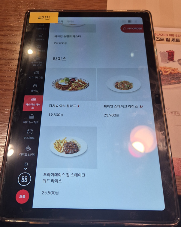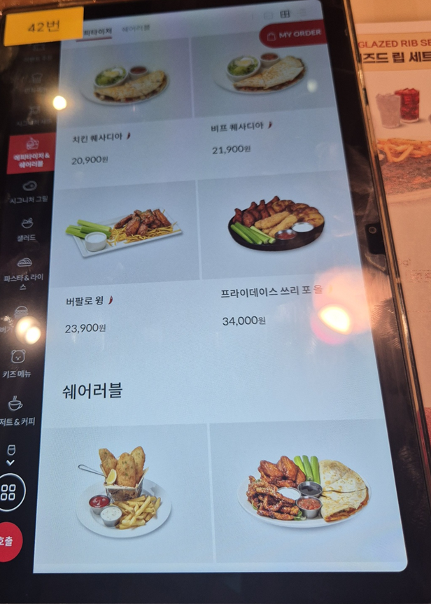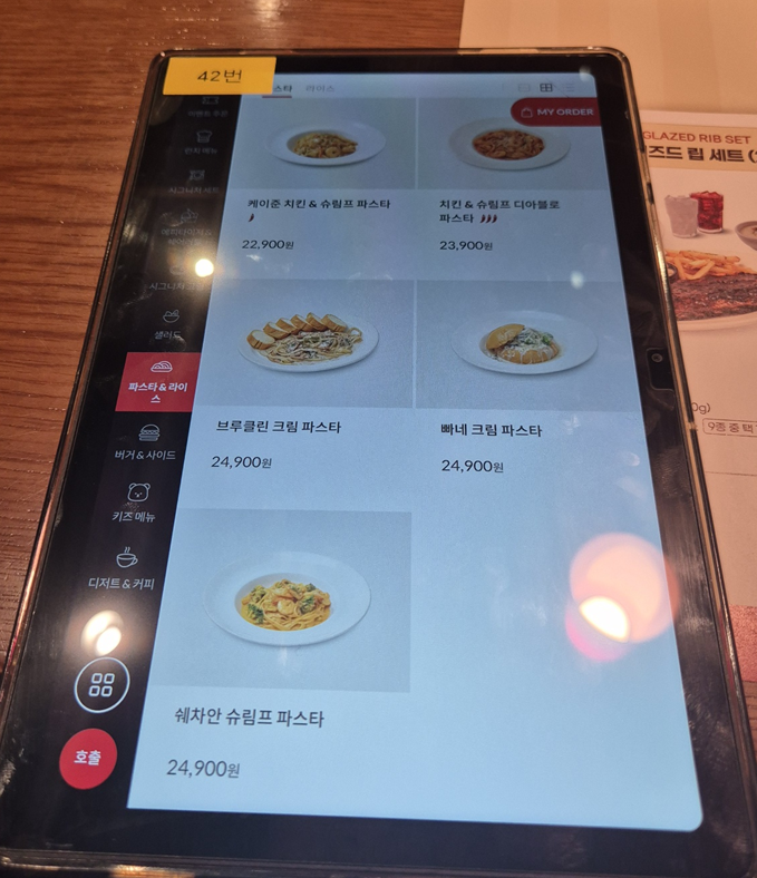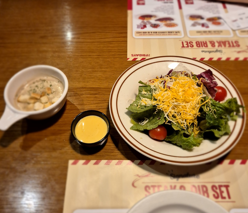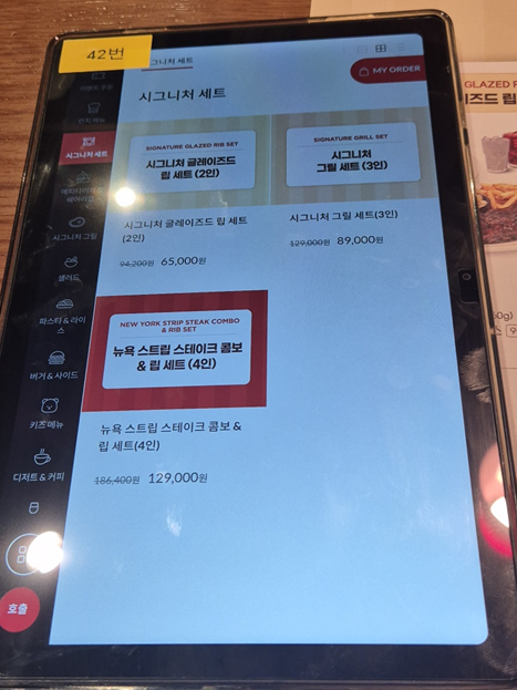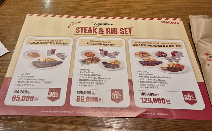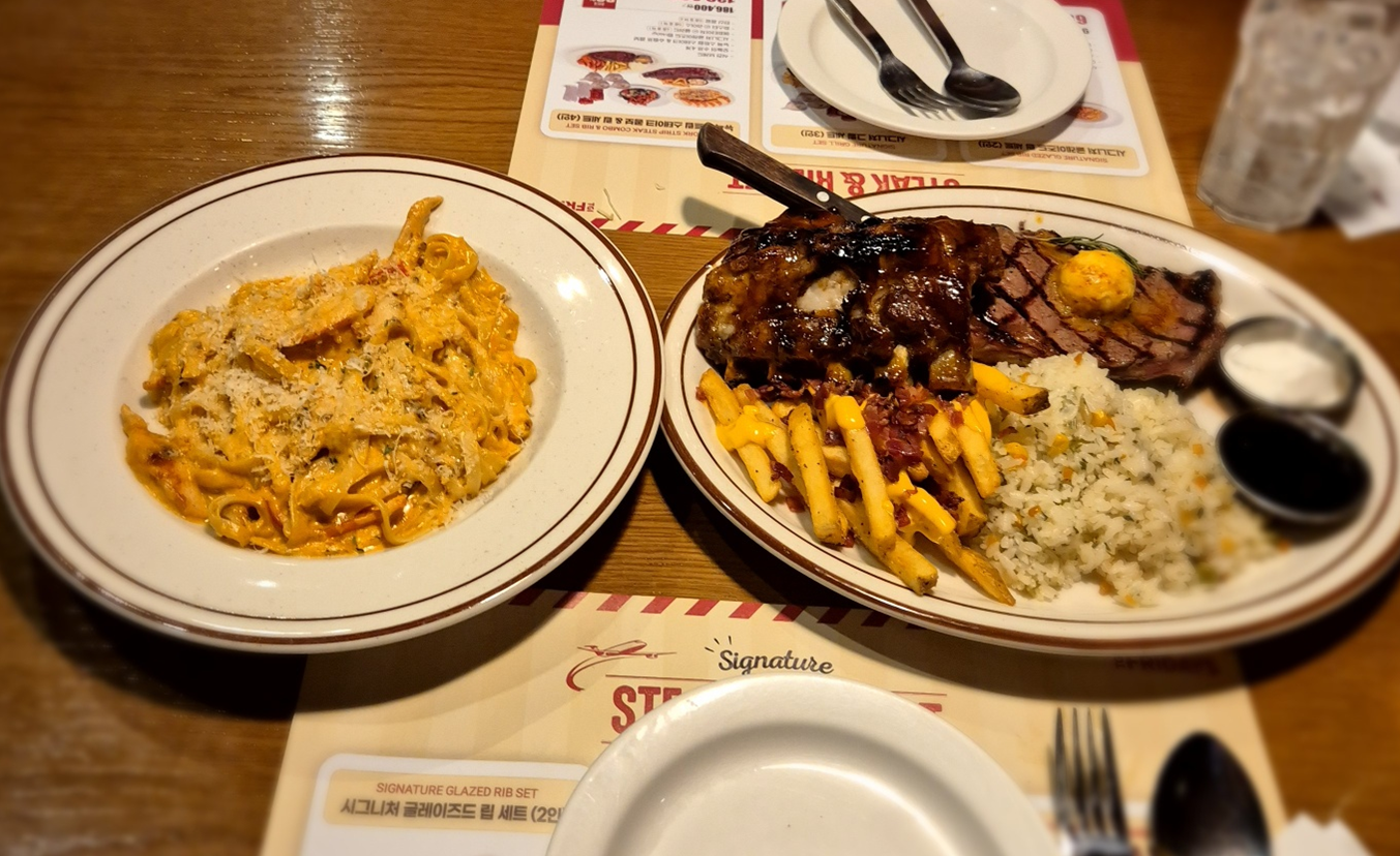 시그니처 립 세트도 있지만 저희는 스테이크도 먹고 싶어서 단품 메뉴로 주문했습니다. 뉴욕 스트립 스테이크&하프 립 콤보, 케이쥰 치킨 & 슈림프 파스타, 가든 샐러드 주문했습니다.