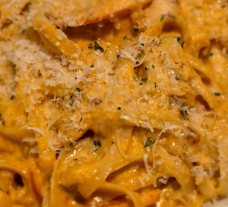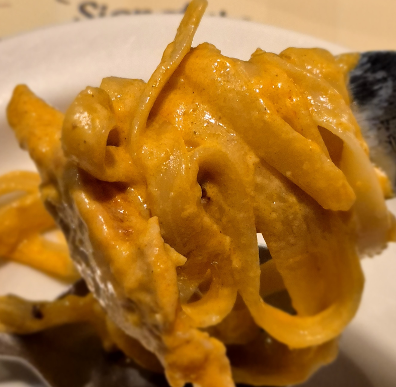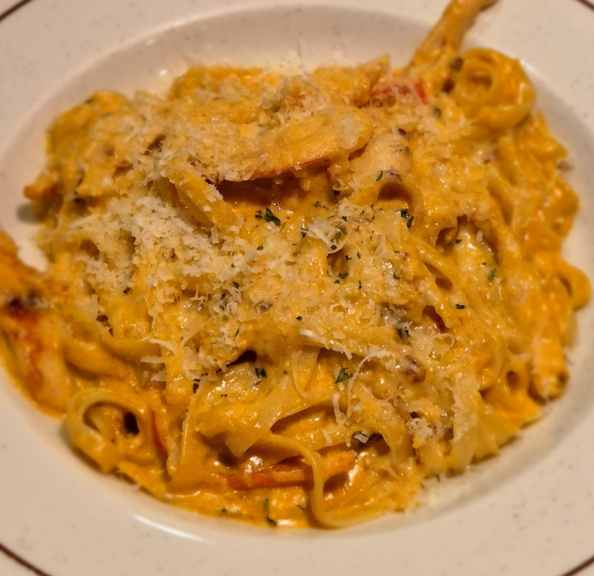 케이쥰 슈림프 파스타는 살짝 매콤한 크림 파스타예요. 정말 많이 꾸덕꾸덕해서 금방 불으니 빨리 먹는 게 좋습니다.
