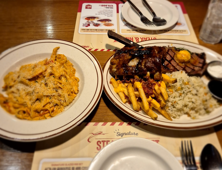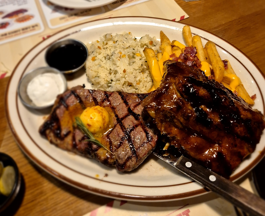 그리고 스테이크와 립입니다.ㅎㅎㅎ 역시 립은 TGI가 최고였습니다. 왜 시그니처 메뉴인지 알겠더라고요. 립은 뼈만 많을까 봐 스테이크와 함께 시킨 것도 있는데 립으로만 주문했어도 좋았을 것 같다는 생각은 했습니다. ㅠㅠㅎㅎ