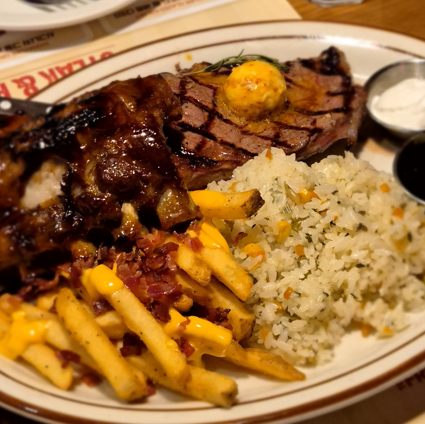 저는 뉴욕 스트립 스테이크&하프 립 콤보에서 치즈 베이컨 프라이와 야채 볶음밥을 주문했습니다.