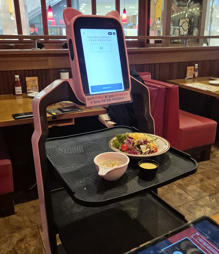 여기도 로봇이 음식을 가져다 줍니다.ㅎㅎㅎ 가장 먼저 가든 샐러드와 트러플 머쉬룸 스프가 나와요. 스프는 스테이크 주문할 때 함께 주문했습니다.