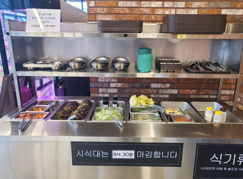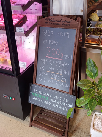 셀프바 옆에 큰 고기 쇼케이스가 있습니다. ㅎㅎ 하나씩 골라 카운터에서 계산하면 되는데 300g씩 담겨 있어 하나씩 쇼핑하기 재미있더라고요.ㅎㅎ 1등급 암퇘지 한돈으로 목살, 오겹살, 항정살이 있었고, 1등급 이상의 한우로 등심, 채끝, 갈비, 부채, 살치살이 구비되어 있었습니다.ㅎㅎ