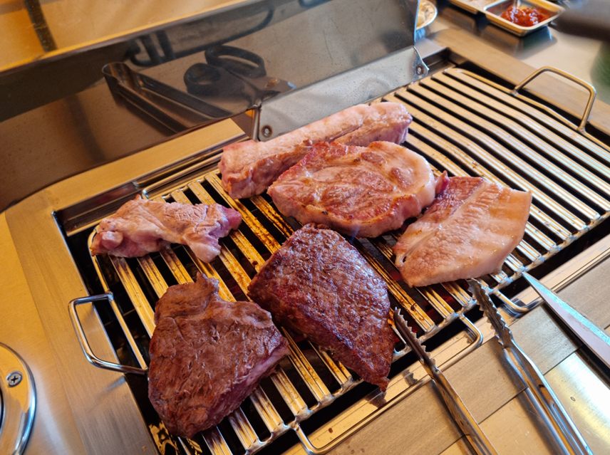본격적으로 식사를 하기 시작하는데 불판이 한쪽 테이블에만 있는 게 조금은 아쉬웠어요. 그렇지만 저희는 애기를 봐야 하기 때문에 돌아가면서 먹어야 했기 때문에 문제없이 먹을 수 있었습니다. ㅎㅎ 위의 사진에서 소고기가 있는 왼쪽 판에 불이 있고, 오른쪽에는 없는 것 참고하셔야 할 거 같아요!ㅎㅎ 덕분에 익은 고기를 태우지 않고 맛있게 먹을 수 있었습니다. ㅎㅎ 참, 숯은 두 번 구운 비장탄 숯으로 제공된다고 하네요!ㅎㅎ