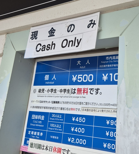 창구는 현금의 도시인 일본답게 현금만 받는 곳이 따로 있고, 현그금, 카드 모두 가능한 곳이 있으니 잘 보고 대기하면 됩니다. 성인은 500엔으로 한국돈 5,000원 정도 되는 금액입니다.