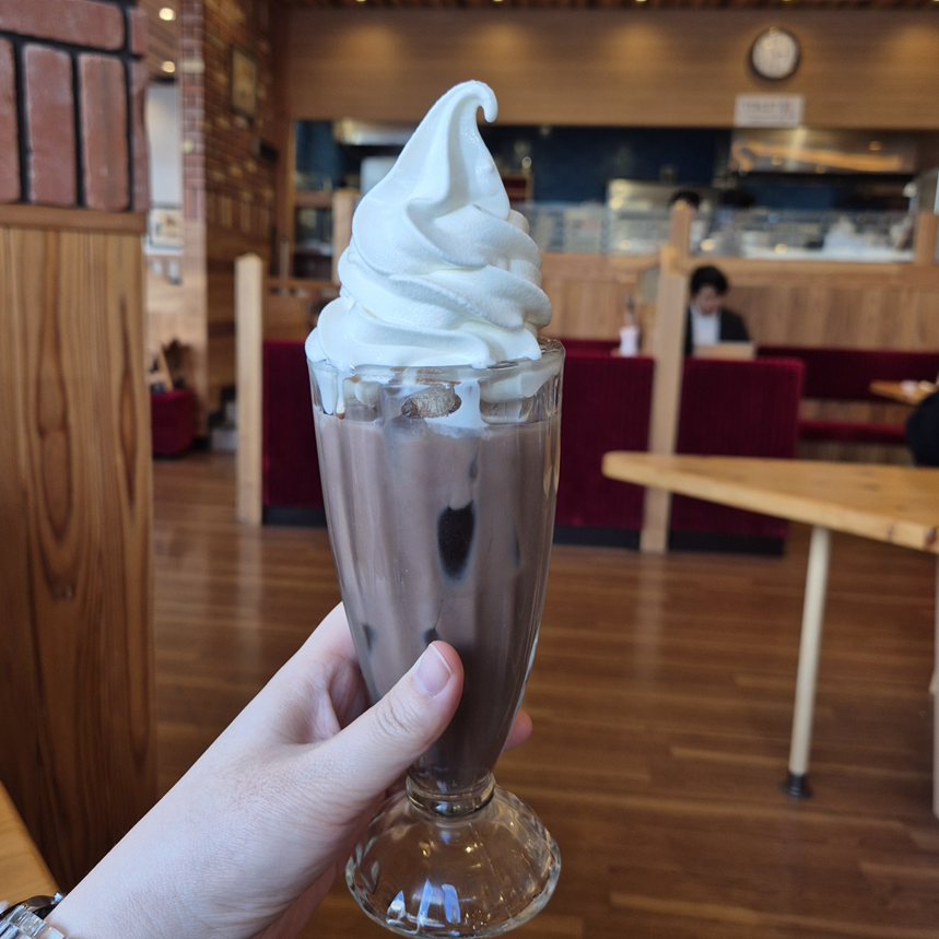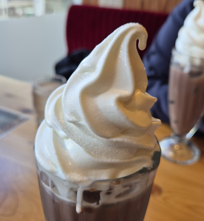 제가 주문한 아이스 코코아입니다. ㅎㅎㅎㅎ 코코아 위에 소프트 아이스크림이 올라가 있어요.ㅎㅎㅎ 아이스크림과 코코아 사이에 공간이 보여 조금 아쉬웠지만 아이스크림이 녹으면서 넘치기 때문에 비워둔 이유가 있던 거였어요. ㅎㅎ
