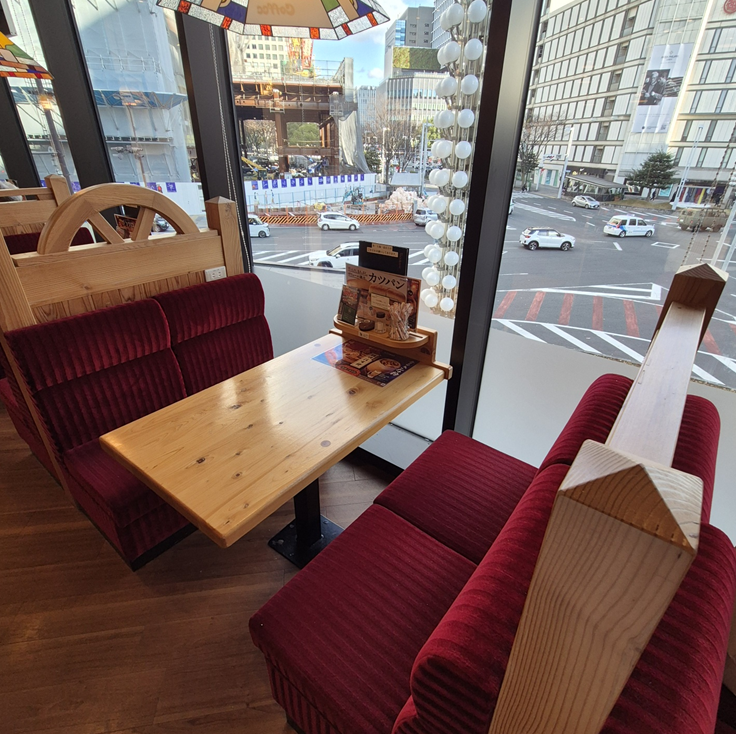 오후 시간이라 그런지 꽤 한산했고, 공부하는 분들도 많고, 신문 보고 계시는 어르신들도 많으셨어요.ㅎㅎ 자리가 많이 있어 저희는 자리를 안내받아 창가 쪽에 앉았습니다. ㅎ 미츠코시 백화점이 바로 앞에 보이는 뷰였어요.ㅎㅎ 그리고 앉아 있으면 영어 메뉴판과 함께 얼음물, 따뜻한 물수건을 주십니다. ㅎㅎ