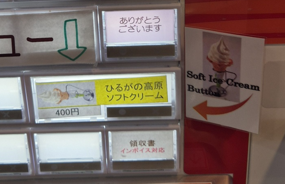 아이스크림은 자판기 아래쪽, 돈 넣는 곳 바로 옆에 있습니다! 금액은 하나당 400엔으로 가격이 꽤 높은 편이에요. 현금만 가능하니 참고하세요!