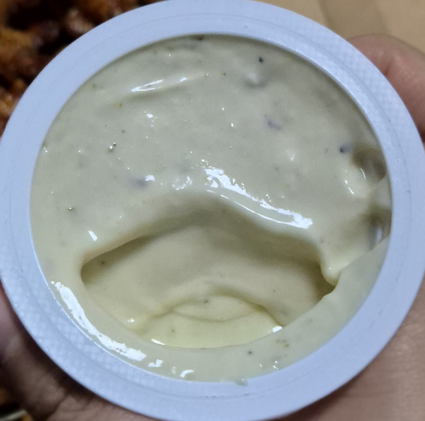 치킨과 함께 노랑대파 올리브마요 소스도 왔어요. 살짝 초록빛이 은은하게 돕니다.ㅎㅎ 크게 자극적인 맛은 아니고 살짝 파향이 풍기는 고소한 마요 소스입니다.