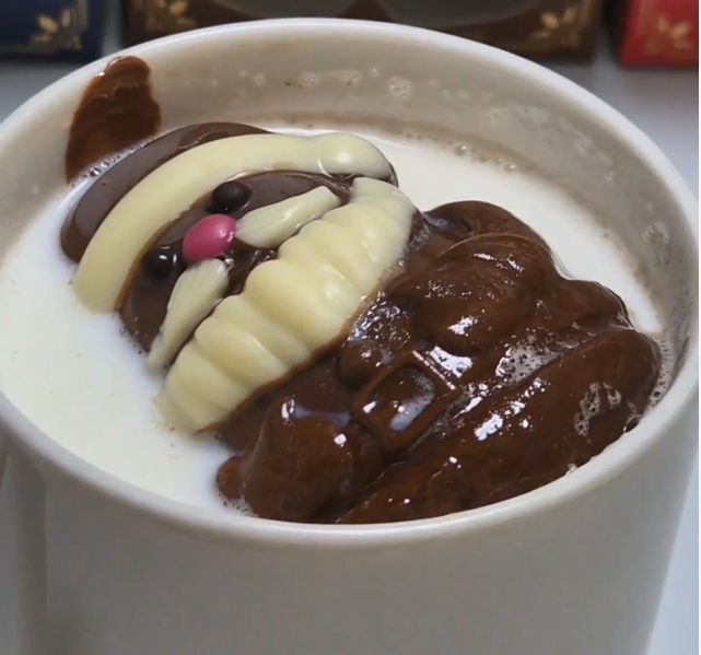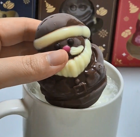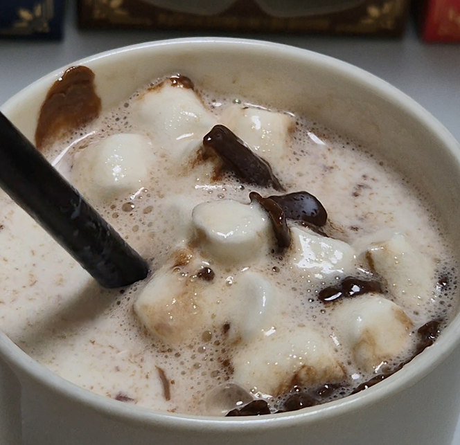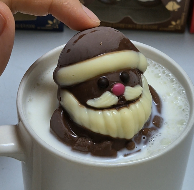 10~11개 정도의 마시멜로우로 보였는데 산타클로스에 마시멜로우가 가장 많이 들었습니다. 개인적으로 마시멜로우가 초코보다 훨-씬 달게 느껴졌습니다. 한 번에 많은 양의 마시멜로우를 드시면 극강의 단맛을 느껴 밀크 초코인데도 슴슴한(?) 맛의 초코 우유를 드시게 될 것 같아요. 그래서 마시멜로우는 나눠서 드시길 추천드립니다!