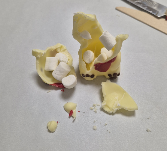반으로 잘라보니 폴라베어도 마시멜로우가 9개 정도 들어 있습니다. 저는 주지하였듯 마시멜로우를 좋아하지 않기 때문에 이번에는 초코만 넣어 먹었습니다. ㅎㅎ