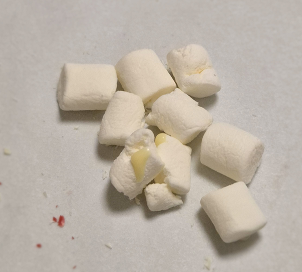 녹아 가는 산타를 한번 뒤집어 보니 산타 안에 있던 마시멜로우들이 떠오릅니다.