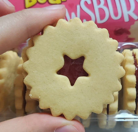 스트로베리는 쿠키 사이에 딸기 잼이 들어 있어요.ㅎㅎ 후렌치파이의 딸기 잼과 비슷한 쨈이 들어있는데 과자의 담백함과 잘 어울렸어요.ㅎㅎ
