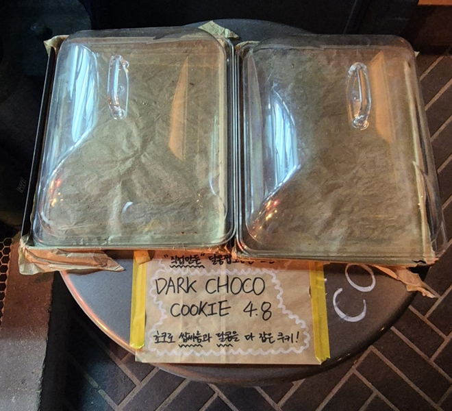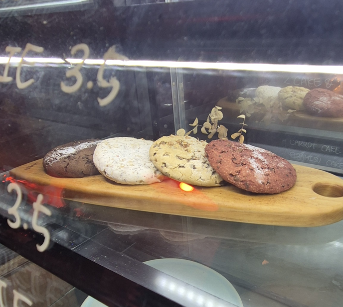 늦은 시간이라 쇼케이스에는 쿠키와 크럼블 케이크만 남아 있었어요.